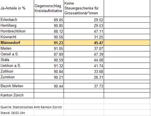 Bei der Initiative „Keine Steuergeschenke für Grossaktionärinnen und Grossaktionäre“ resultiert in Männedorf der dritthöchste Ja-Stimmenanteil (nach Oetwil und Hombrechtikon).