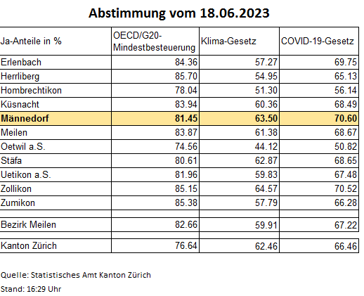 Der Nein-Anteil bei der OECD/G20-Mindestbesteuerung ist in Männedorf am vierthöchsten, mit 18.55%. Am meisten Neinstimmen gab es in Oetwil am See mit 25.44%, danach folgen Hombrechtikon und Stäfa.