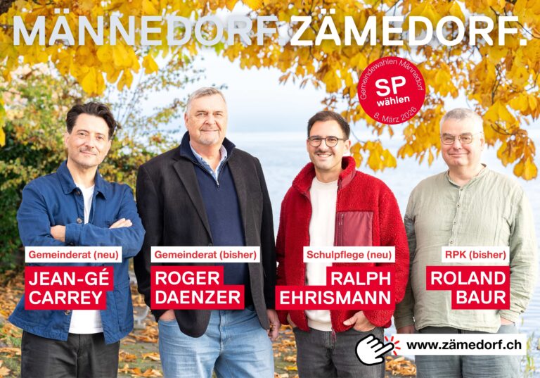 Männedörfler Behörden brauchen Ausgleich und Meinungsvielfalt – im Gemeinderat, in der Schulpflege und in der RPK. Aktuell sind bürgerliche Parteien überrepräsentiert. Aus diesem Grund stellt die SP Männedorf starke Kandidierende für progressive Stimmen!